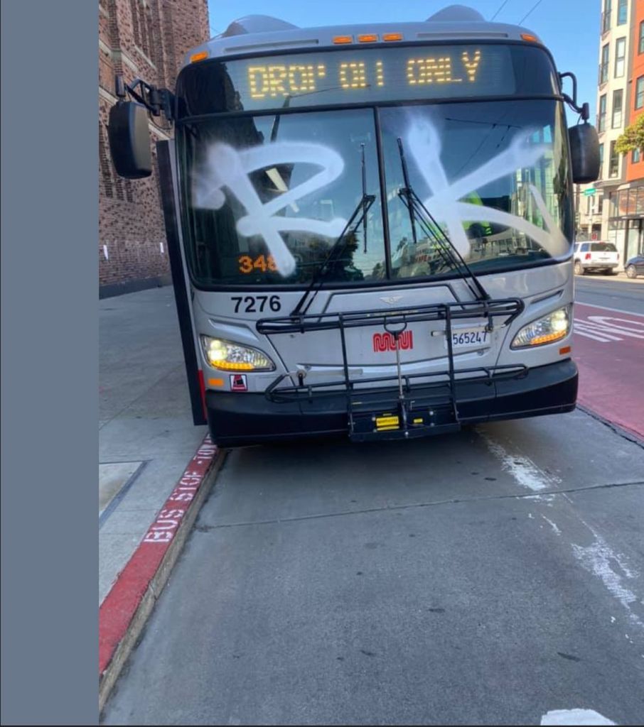 That’s the last straw. You went over the line. It’s one thing to put some initials on the tail end of a bus as we pull away from 18th and Mission, but it’s a whole different ball game to completely block an operator’s view on the front window.