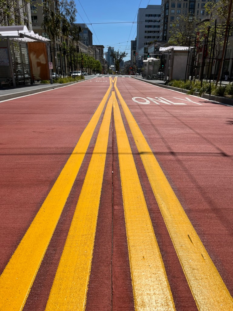 At long last, the Muni Rapid Lanes are complete on Van Ness! Although critics imply the time savings for riders is only a few minutes in comparison to the lane revisions and bus stop closures over years of delays, I’m here to point out the real advantages these twin rapid lanes present to the future. The bitter angst created during construction can now be cleared —as water over the Aquatic Park Pier, or —milk spilled on the floor of the Grubstake on Pine Street.