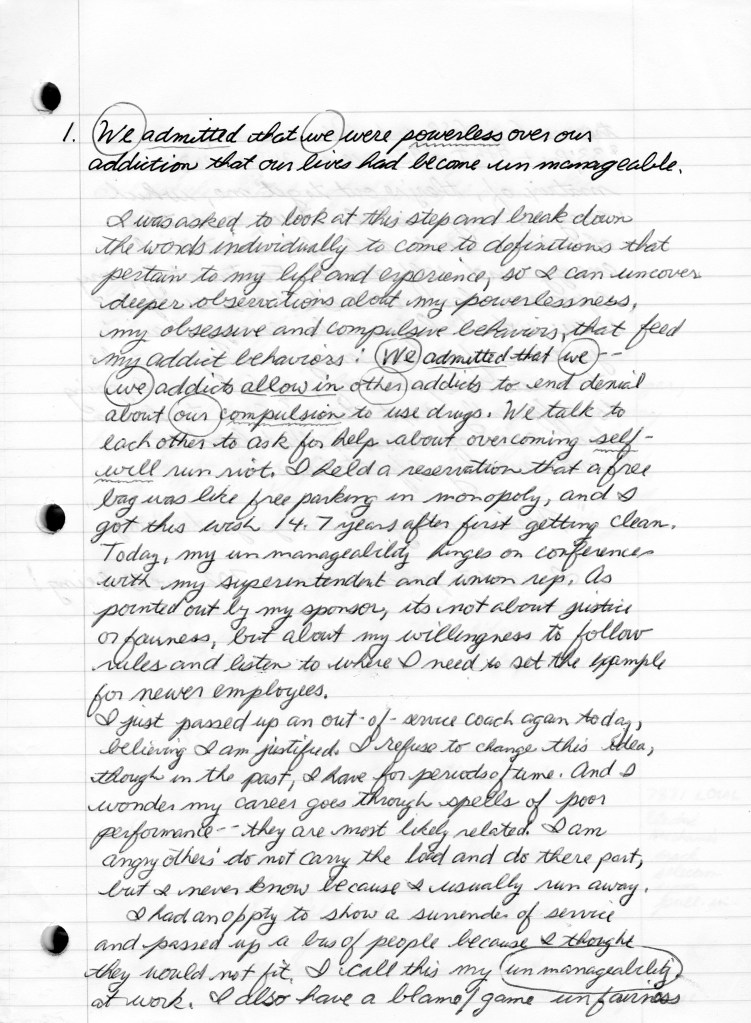 We admitted we were powerless over alcohol–that our lives had become unmanageable. This is the first step of Alcoholics Anonymous, and apparently, it’s the only step that has to be done perfectly. Yet, the first thing I hear during the first reading, ‘How It Works,’ is that on our journey in recovery from alcoholism, we’re supposed to seek progress, not perfection. So what you saying?