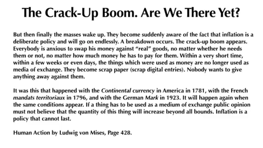 According to maneco64 and his YouTube channel from the UK, he frequently quotes Ludwig von Mises “Human Action” on page 248 per the final flag down to a crack-up boom. Think of the wheelbarrow of fiat currency for a loaf of bread in Germany. I can only hope a new vision of a new version of Quantitative Easing, use of the Dollar Milkshake Theory, or Twist, can engender the full faith and credit of the United States Treasury as the outgoing world’s reserve currency. In the past, war breaks out when the dominant hegemonic empire crumbles. (See Ray Dalio)