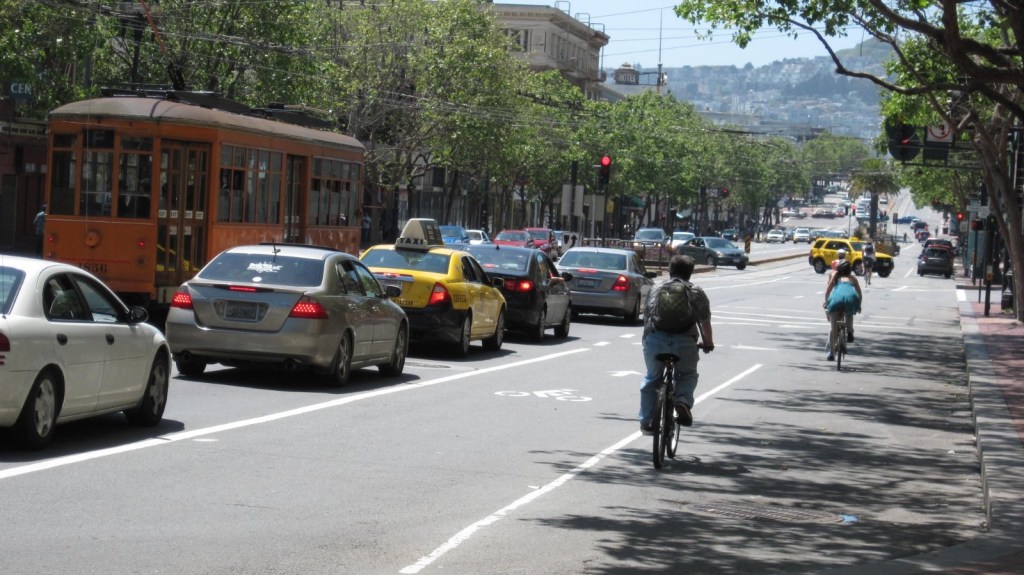 First off, dear bike riders, take the parallel street! Usually there is a nice residential, less commercial street just off of a transit artery that is immensely safer for less conflict collision. Scott Street or Baker off Divisadero for starters. Page Street instead of Oak or Haight. Valencia instead of Mission. Howard Street with marked bike lane sharrows instead of scary Mission Street. Polk instead of Van Ness. The list goes on. It just is not safe to be on Van Ness or Divisadero during peak period, or what most call rush hour.