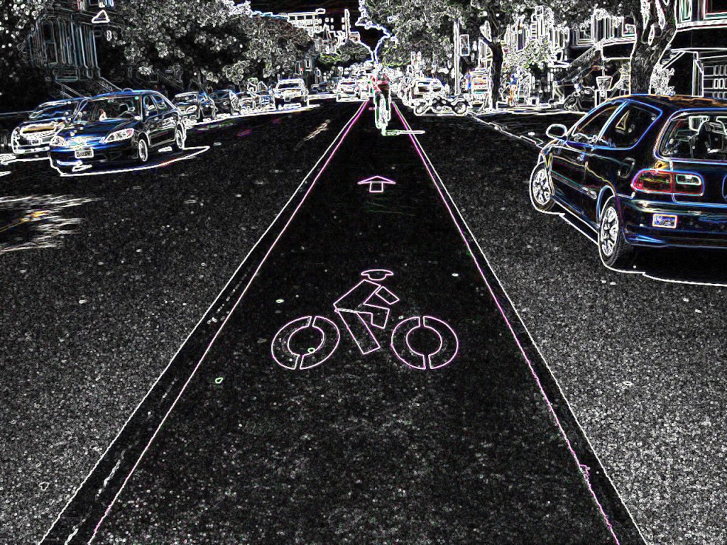 Sharrows are the arrow-like bike icons indicating a shared lane with vehicular traffic. They are stenciled in the center of the lane so cars are not in a reduced width lane because of a separate lane for bikes. All these extra paint marks on the street do make for a confusing first time if you are in a car visiting San Francisco. What with transit islands and taxi and bus lanes, the driving space for regular traffic becomes constricted. This philosophy is extended to discourage automobile use, but with the advent of rideshare vehicles in large numbers, the squeeze play can become not unlike a video game. But unlike on a screen, injury and collision are real.