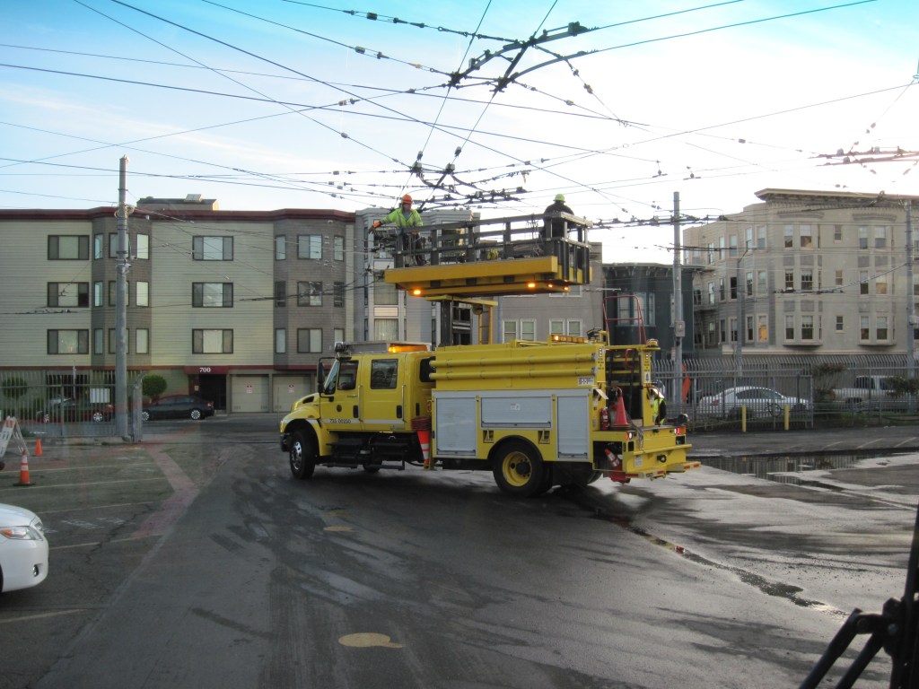 We are also to cradle our poles in the harp before we move in epu mode. The yard is flat, and there is very little sway in the right turn we make, so in moist, foggy weather, we usually hit the poles’ down button and move through from track five to four to the gate to put our poles back up. If we have good battery power, we cradle our poles and make the right turn out the gate and onto Bryant to return the poles to the wires. It is important to leave enough breathing room behind us for traffic to go around us safely as we put up our poles. This happened today as I pulled out, and all went well until crossing the first intersection at 17th and Bryant. My leader in the yard made a left turn on 17th to head for the 6 line. It was cold overnight, and we recently had lots of rain. The switches can be sticky until the sun has had its say. My poles followed his track to the left and I dewired. The selectric boxes did not reset the toggles after I passed by them straight on. Fortunately, my collectors did not catch on the wires, and I hit the poles’ down button and checked to see if I was clear of any tangle. Good. I engaged EPU to clear the intersection and to step to the back of the bus and cradle my poles in the harp.