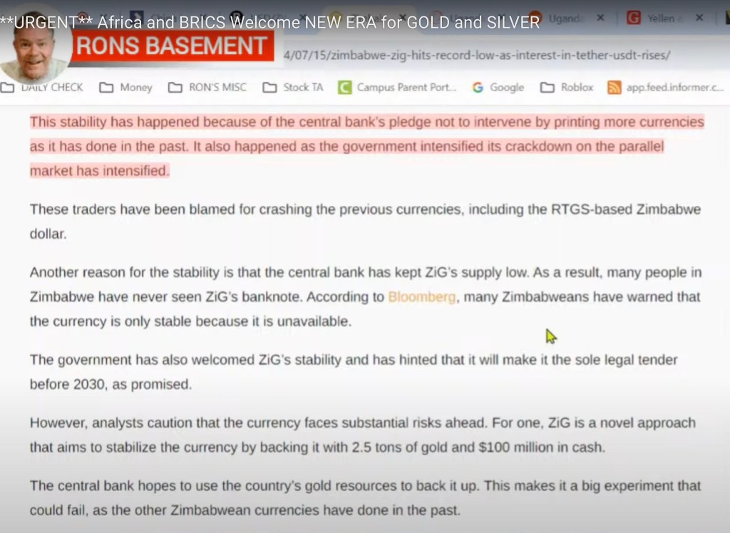 In a recent Bloomberg article about Zimbabwe, a novel idea about bringing that country’s inflation down to a manageable level was cited: backing the Zig, the Zimbabwe currency, with gold from their gold mines.