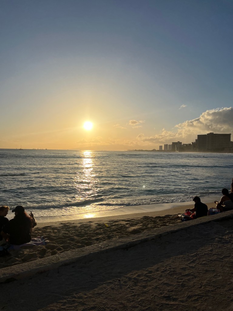 The sunsets in Waikiki are hard to beat. The sun is angled perfectly for sunsets. Getting out to walk in the healthful red sun waves is great nourishment for the body and skin.